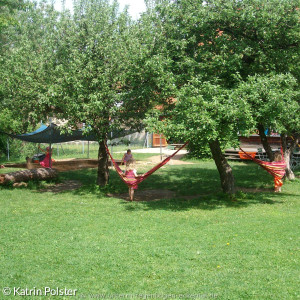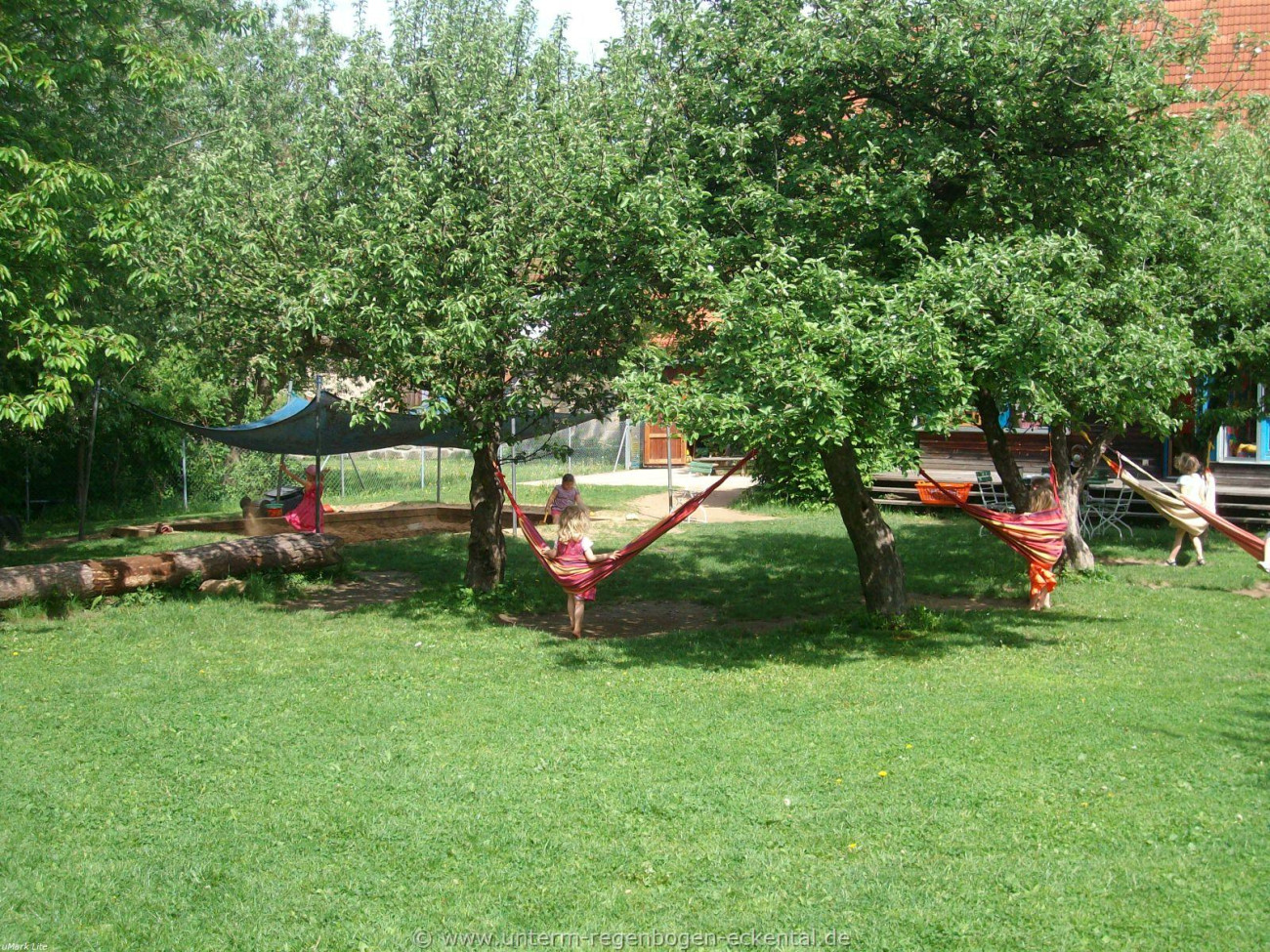 Der große Obstgarten mit altem Baumbestand bietet nicht nur im Sommer genug Schatten, sondern lädt mit den Hängematten, dem Erlebnisgraben und der Spielwiese zum Entspannen, Spielen und Entdecken ein. 2015 wurde die Kletteranlage erneuert und bietet neben der Wasser-Matsch-Bahn, den zwei Sandkästen und dem Spiel-Hochhaus genügend Raum um sich individuell zu beschäftigen. Ein abwechslungsreicher Fahrzeugparcours rundet den Außenbereich ab.